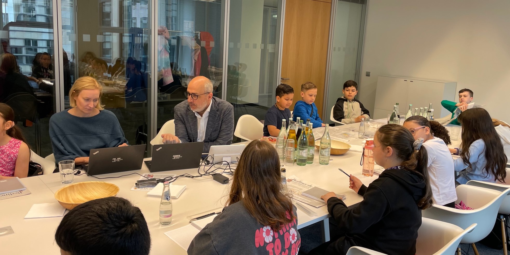 Wir haben uns schon um 8 Uhr getroffen und sind mit Frau Gösmann und Herrn Jäckle mit einem Bus und einer Bahn nach Berlin-Mitte gefahren. Um 9 Uhr waren wir bei der großen Konferenz der Funke-Mediengruppe, in der die Zeitung erscheint. Wir haben zugehört und auch Fragen gestellt. Dort waren alle Chefs aus ganz Deutschland auf Bildschirmen zu sehen. Wir durften an einem riesigen Konferenz-Tisch mit Mikrofonen und Kameras sitzen. Für uns gab es leckere Getränke und Brezeln. Nach der Konferenz haben wir ein Interview mit dem stellvertretenden Chefredakteur Jochen Gaugele und der Online-Chefin Laura Himmelreich gemacht.
