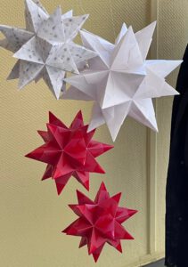 Ende November hatte die ganze Schule wie jedes Jahr Weihnachtsbastel-Tag. In unserer Klasse haben wir große Papier-Sterne gebastelt: Dazu haben wir 7 weiße Frühstückstüten zusammengeklebt und Muster reingeschnitten. Beim Auseinanderfalten gab es schöne Sterne. Damit haben wir unser Klassenzimmer geschmückt.