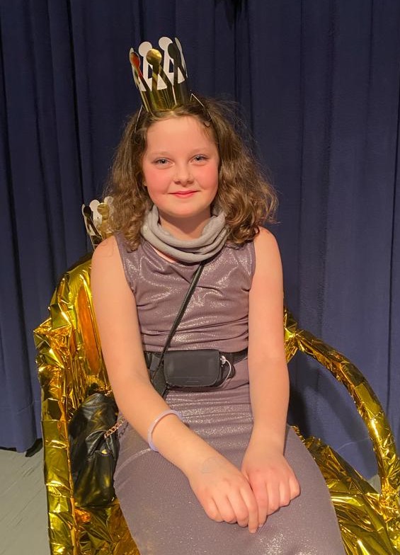 Frau Müller ging auf die Bühne und spielte ein paar Weihnachtslieder. Dann ging die Party los und wir tanzten viel. Es fand ein Tanzduell nach Farben der Knickarmbänder statt. Es gab also die Gruppen Blau, Gelb, Grün, Orange, Lila und Pink. Zum Schluss wurden eine Ballkönigin und ein Ballkönig gewählt: Aimee und Andrej haben gewonnen.